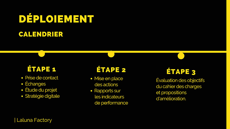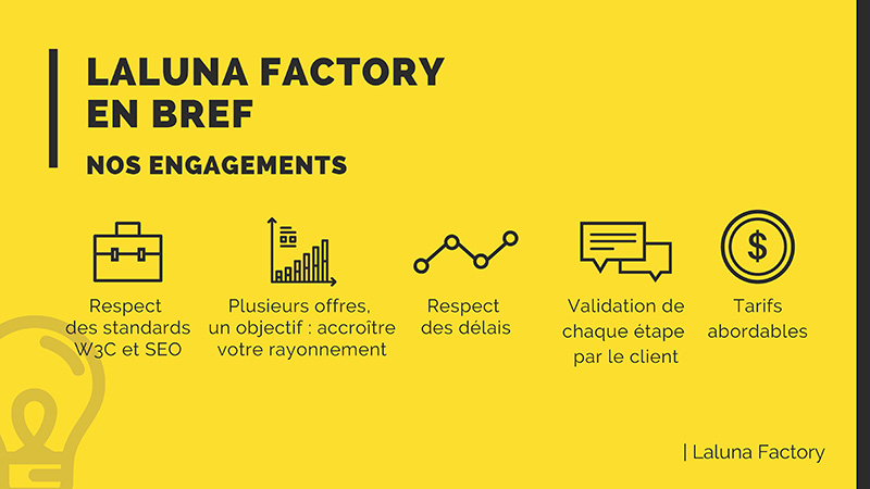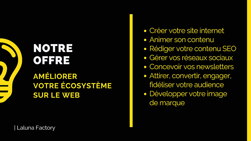 Tout d’abord, Laluna Factory intervient dans la gestion de projet web, création de site internet, rédaction SEO ou print, stratégie social media. De la même manière, nous participons au référencement naturel de votre marque, son référencement payant, modélisation de bot, programmation de plateforme E-learning… En fait, quelque soit votre projet, il mérite un investissement total de notre part. Car à travers lui c’est sa dimension humaine qui nous importe.
